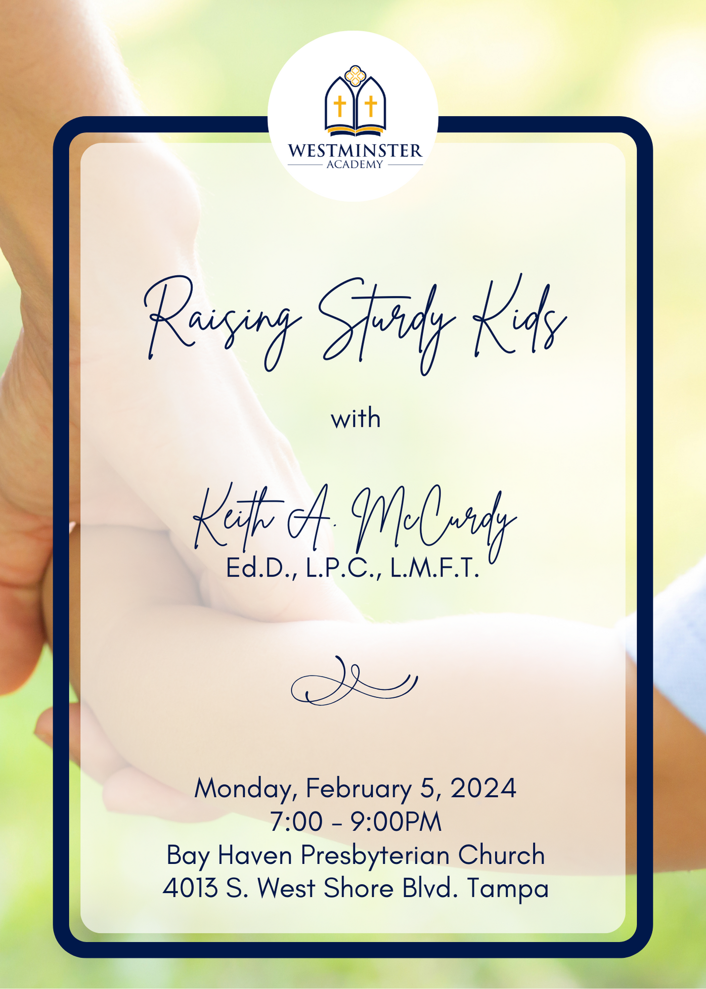 As parents and educators, we desire to raise children who are resilient and resourceful. In today's environment, this is an increasingly difficult task. Westminster Academy is delighted to introduce Dr. Keith McCurdy as he provides valuable insight into current cultural and psychological dynamics that impact children and parents. Parents will leave this event feeling challenged, encouraged, and equipped to Raise Sturdy Kids.